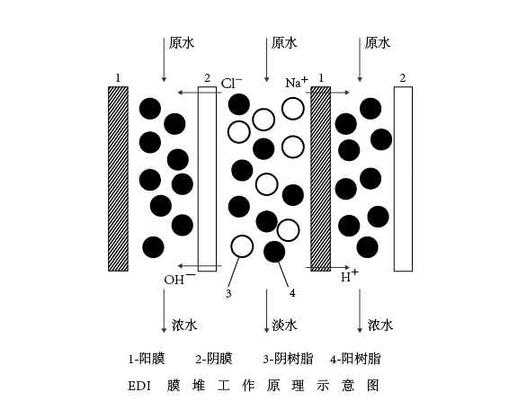 EDI 膜堆將電滲析技術(shù)與離子交換技術(shù)相結(jié)合,利用陰\陽離子交換膜、離子交換樹脂、淡\濃水分離室等部件組成工作單元,依據(jù)產(chǎn)水量組裝成各種型號(hào)的膜堆,在外加直流電場驅(qū)動(dòng)下實(shí)現(xiàn)水的純化,有效脫鹽率高,產(chǎn)水水質(zhì)穩(wěn)定,可連續(xù)生產(chǎn)高達(dá)16~18 MΩ·cm 以上的超純水。