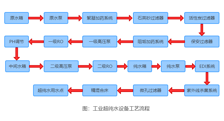 3.采用反滲透設(shè)備與電去離子(EDI)設(shè)備進(jìn)行搭配制備電子工業(yè)超純水的的方式,這是一種制取超純水的新工藝,也是一種環(huán)保,經(jīng)濟(jì),發(fā)展?jié)摿薮蟮某兯苽涔に嚕浠竟に嚵鞒虨椋涸嘟橘|(zhì)過濾器→活性炭過濾器→精密過濾器→中間水箱→反滲透設(shè)備→電去離子(EDI)→超純水箱→超純水泵→后置保安過濾器→用水點(diǎn)。