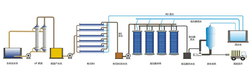 2.超濾產(chǎn)水進(jìn)入卷式RO膜系統(tǒng)進(jìn)行膜分離處理,卷式RO清水排放至清水收集池,濃縮進(jìn)入高壓膜系統(tǒng);