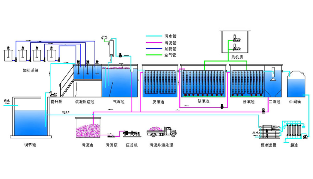 原水 → 格柵 → 調(diào)節(jié)池 → 提升泵 → 混凝反應(yīng)池 → 氣浮池 → 厭氧池 → 缺氧池 → 好氧池 → 二沉池 → 中間桶 →