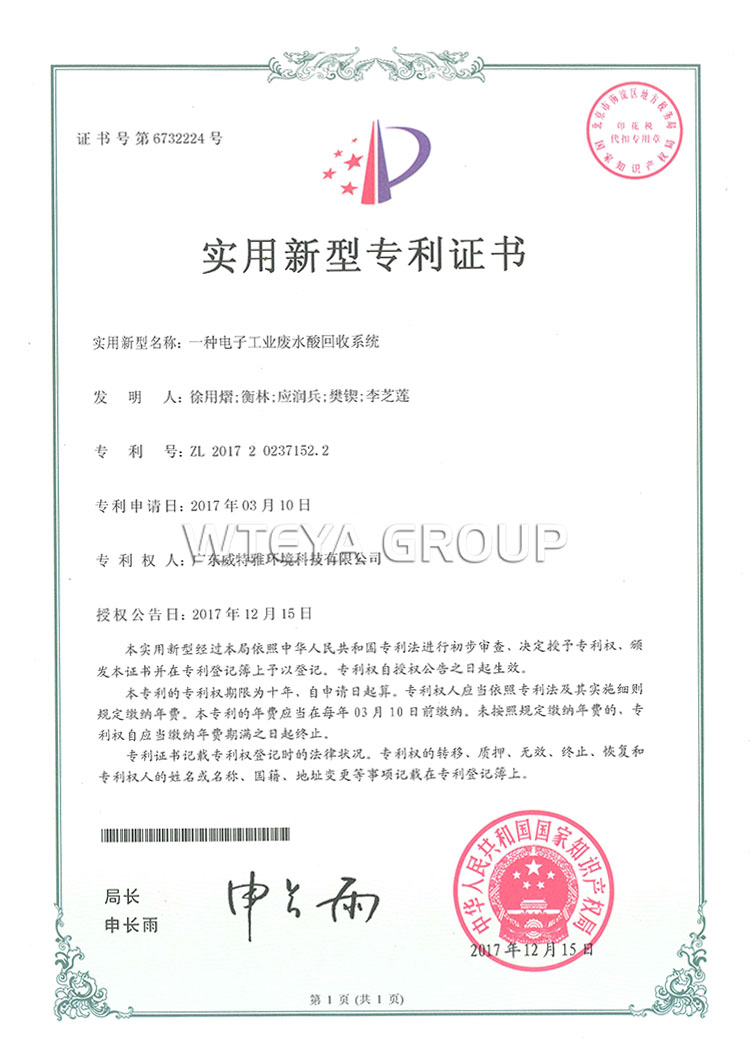 一種垃圾滲濾液處理用壓濾裝置實(shí)用新型專(zhuān)利證書(shū)
