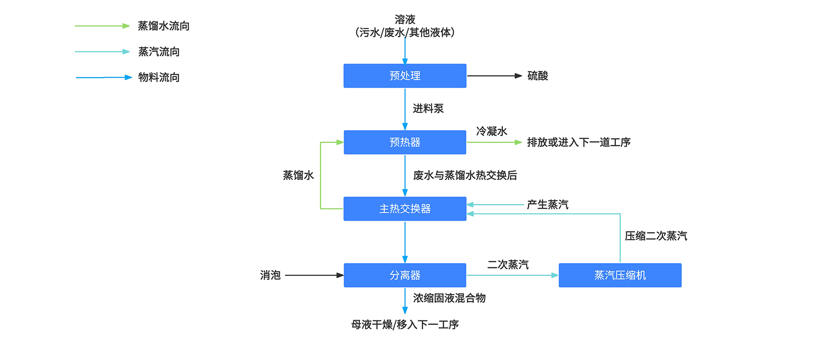 MVR蒸發(fā)器利?機械式壓縮機將蒸發(fā)后的?次蒸汽再壓縮以提?其焓值,溫度壓力得到提?后的?次汽被再次送?加熱室作為熱源加熱進料,??放熱相變成為冷凝?排出。被加熱的物料經汽化濃縮后作為終產物排出系統(tǒng)。