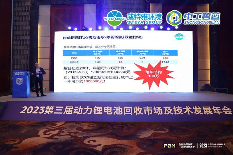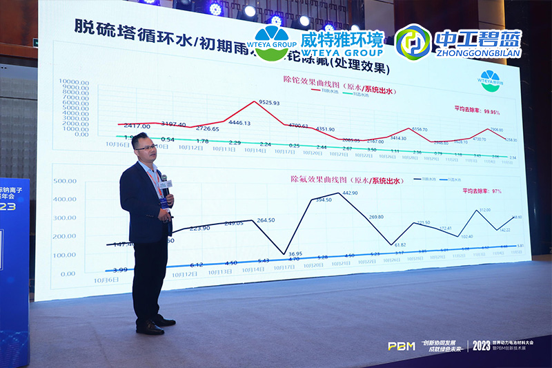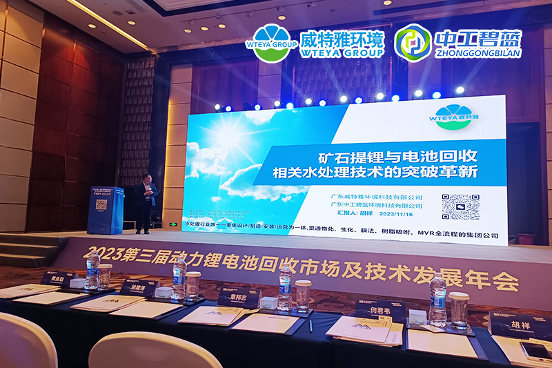 在展會(huì)現(xiàn)場(chǎng),由總經(jīng)理胡祥代表威特雅集團(tuán)&中共碧藍(lán)環(huán)境公司進(jìn)行宣講,向大家介紹了針對(duì)新能源鋰電池生產(chǎn)過(guò)程中所面臨的水處理難題的解決方案,包括廢水除鉈除氟解決方案、沉鋰母液脫色除COD以及廢水零排放等環(huán)節(jié)。并向大家展示實(shí)際工程案例以及處理水質(zhì)效果的對(duì)比,廢水處理效益可以做到每年節(jié)約100萬(wàn)。