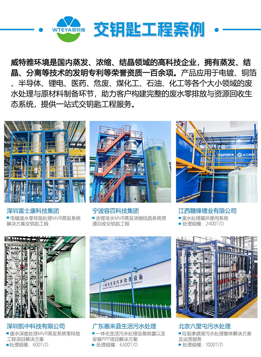 廣東威特雅環(huán)境科技有限公司是一家專業(yè)致力于污水廢水處理的研究、開發(fā)、制造及銷售于一體的科技型企業(yè),十多年經(jīng)驗(yàn),30000㎡生產(chǎn)基地,擁有強(qiáng)大的科研技術(shù)團(tuán)隊(duì)和龐大的運(yùn)營售后團(tuán)隊(duì)500多人。專業(yè)承接鋰電新能源、半導(dǎo)體新材料、工業(yè)、電子、電鍍、制藥、食品、飲料、化妝品、醫(yī)療衛(wèi)生、汽車、冶金、電力等行業(yè)廢水處理服務(wù),為客戶提供有針對(duì)性的一站式廢水處理解決方案!研發(fā)生產(chǎn)銷售各種水處理設(shè)備,包括MVR蒸發(fā)設(shè)備、廢水零排放設(shè)備、中水回用設(shè)備、膜處理設(shè)備、純水設(shè)備、超純水設(shè)備、軟化水設(shè)備、反滲透設(shè)備等,資質(zhì)齊全,擁有100多項(xiàng)榮譽(yù)證書,具備建筑機(jī)電安裝工程專業(yè)承包貳級(jí)施工資質(zhì),項(xiàng)目覆蓋全國,一對(duì)一合作服務(wù),技術(shù)成熟可靠,售后無憂!