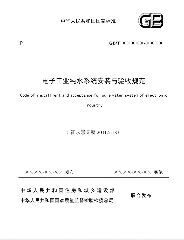 《電子工業(yè)純水系統(tǒng)安裝與驗收規(guī)范》為國家標準,編號為GB51035-2014,自2015年8月1日起實施。