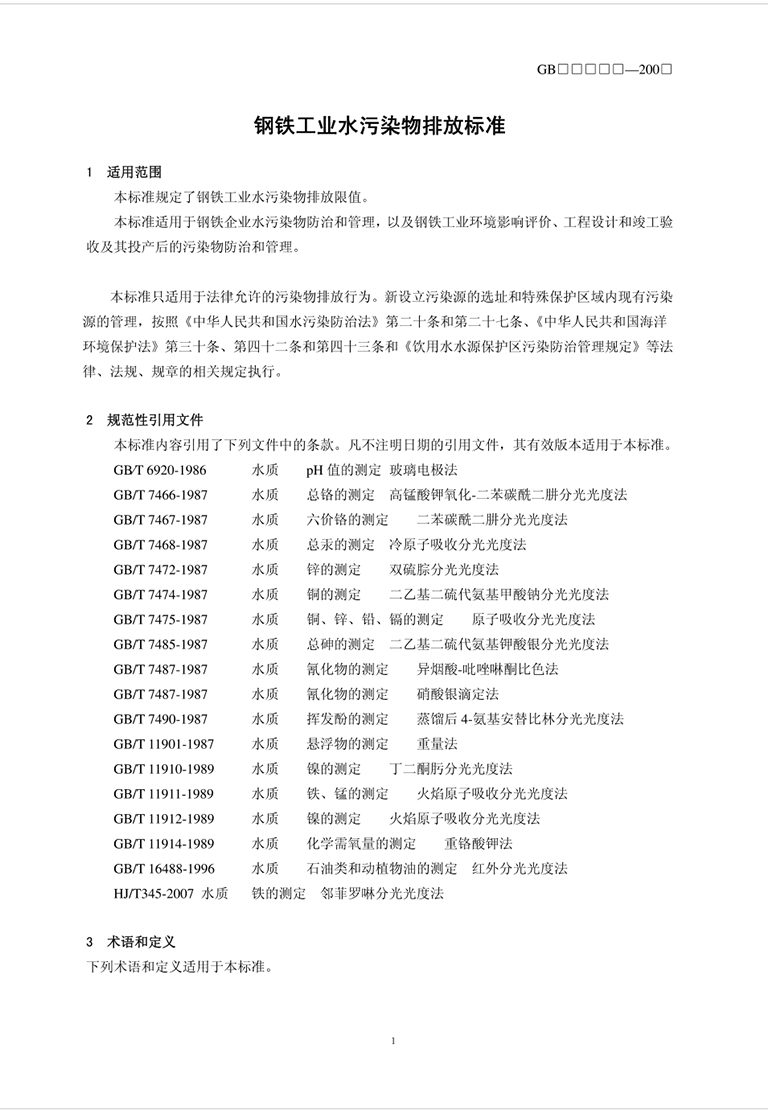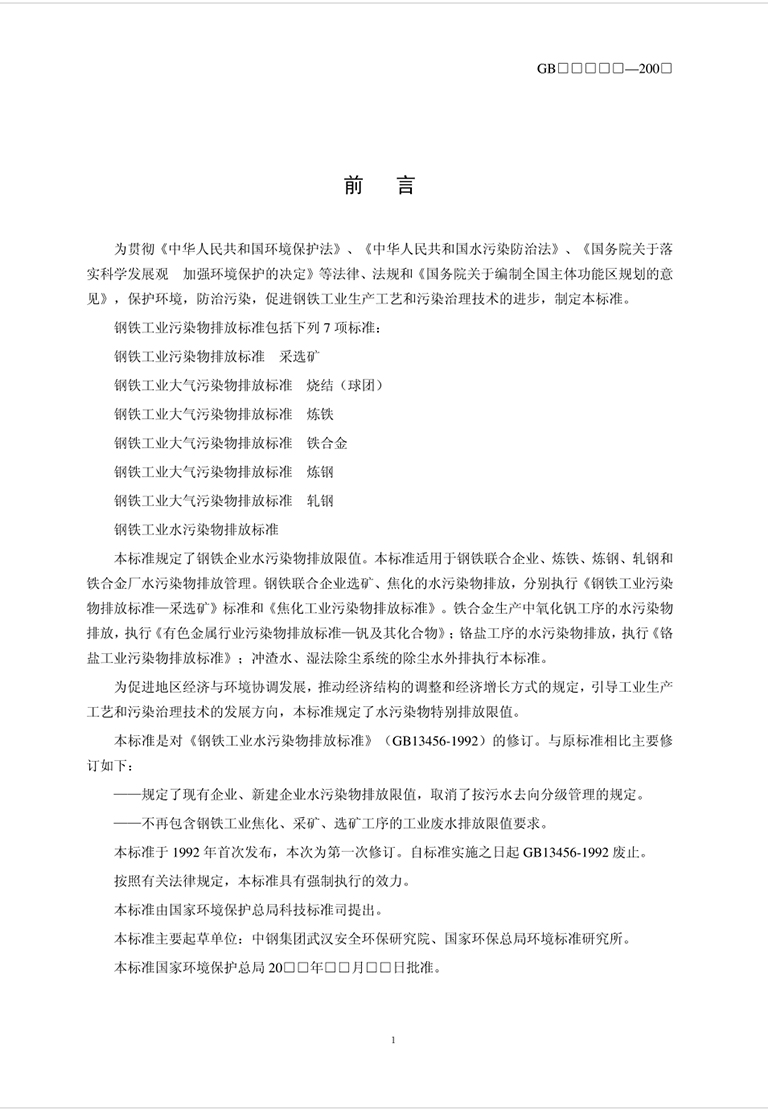 為貫徹《中華人民共和國(guó)環(huán)境保護(hù)法》、《中華人民共和國(guó)水污染防治法》、《中華人民共和國(guó)海洋環(huán)境保護(hù)法》,促進(jìn)生產(chǎn)工藝和污染治理技術(shù)的進(jìn)步,防治水污染,制定本標(biāo)準(zhǔn)。本標(biāo)準(zhǔn)按照生產(chǎn)工藝和廢水排放去向,分年限規(guī)定了鋼鐵企業(yè)的噸產(chǎn)品廢水排放量和主要污染物最高允許排放濃度。本標(biāo)準(zhǔn)適用于鋼鐵工業(yè)的企業(yè)排放管理,以及建設(shè)項(xiàng)目的環(huán)境影響評(píng)價(jià)、設(shè)計(jì)、竣工驗(yàn)收及其建成后的排放管理。