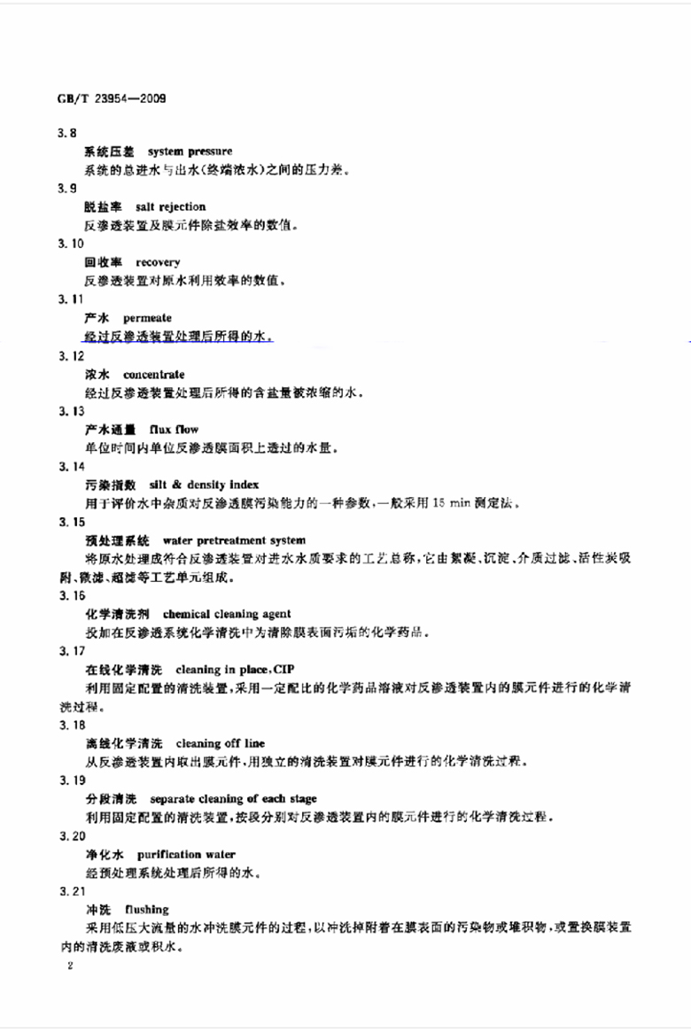 本標(biāo)準(zhǔn)規(guī)定了反滲透系統(tǒng)膜元件清洗過程中的技術(shù)要求、清洗前的準(zhǔn)備工作、污染物判斷、系統(tǒng)清洗及清洗效果驗(yàn)收。