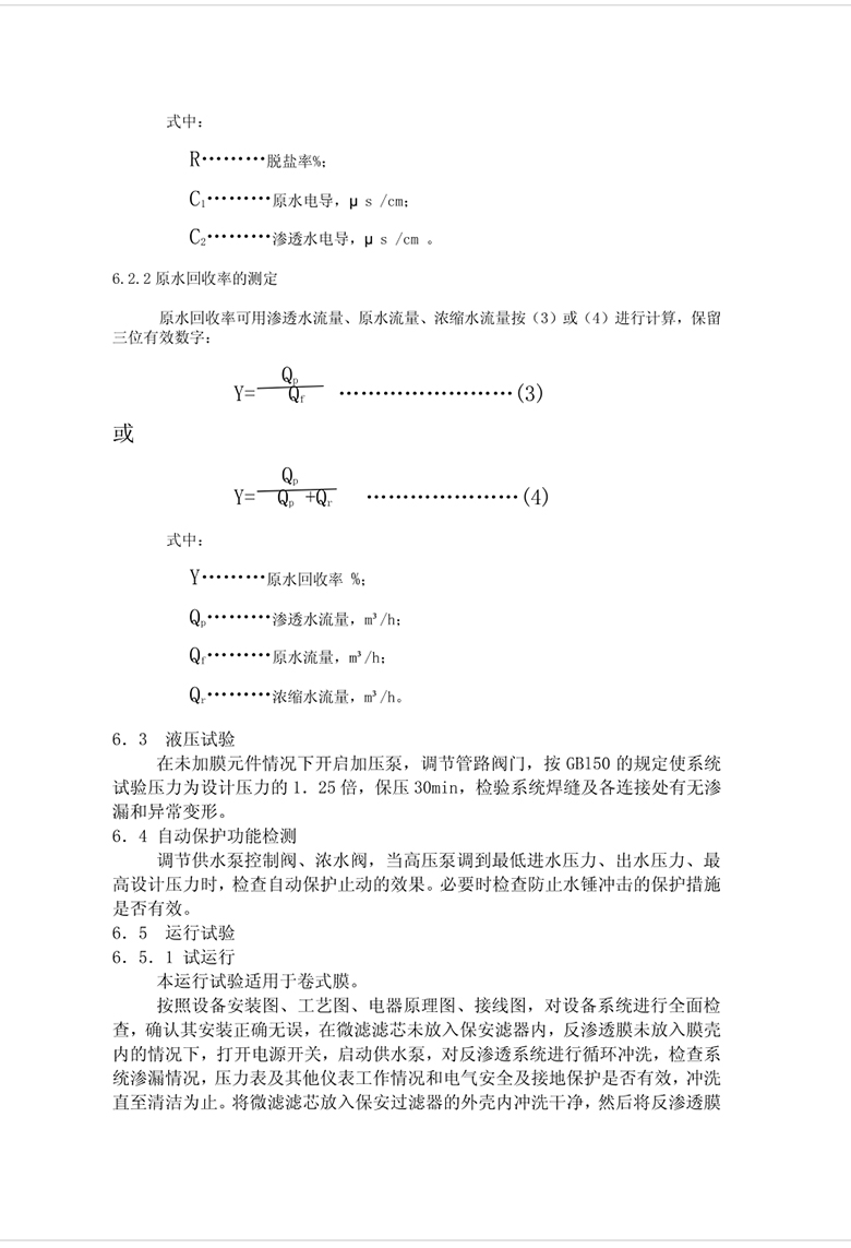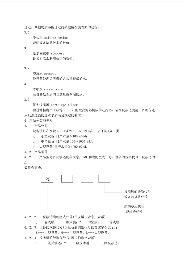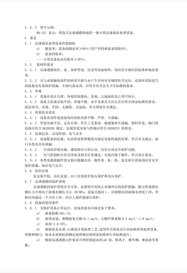 本標(biāo)準(zhǔn)規(guī)定了反滲透水處理設(shè)備(以下簡(jiǎn)稱設(shè)備)的分類與型號(hào)、要求、試驗(yàn)方法、檢驗(yàn)規(guī)則、標(biāo)志、包裝、運(yùn)輸及貯存。