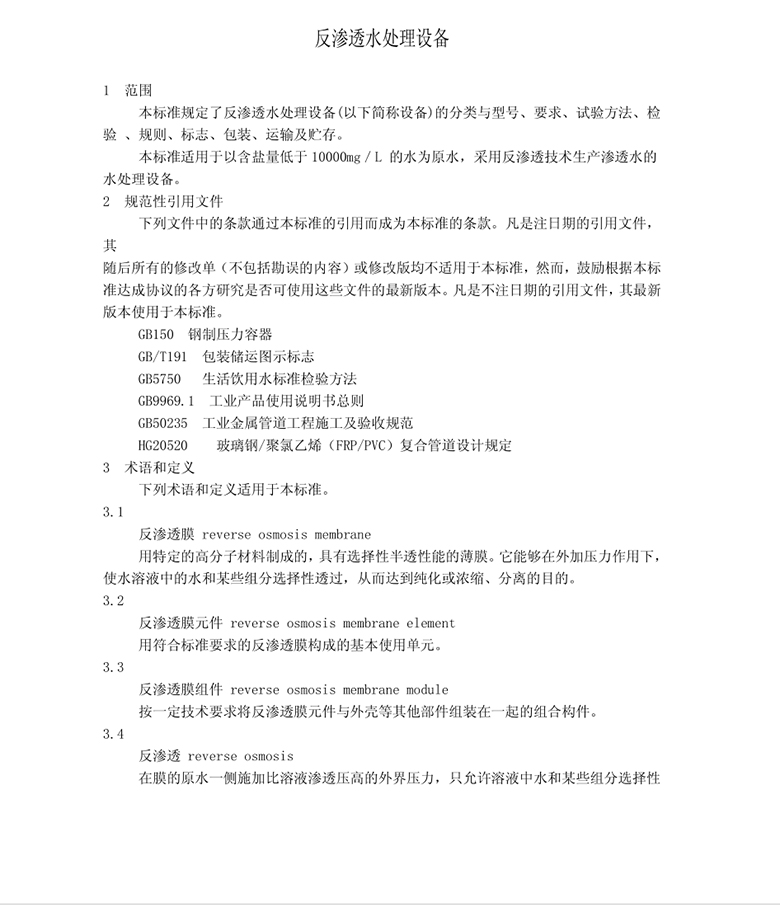 本標(biāo)準(zhǔn)適用于以含鹽量低于10000mg/L的水為原水,采用反滲透技術(shù)生產(chǎn)滲透水的水處理設(shè)備。