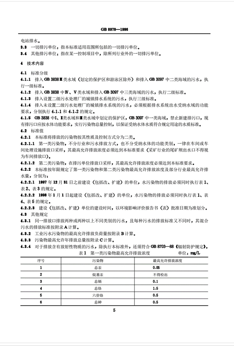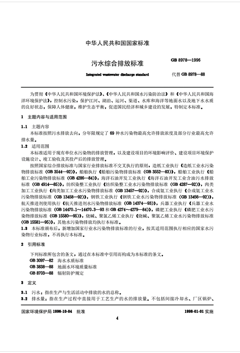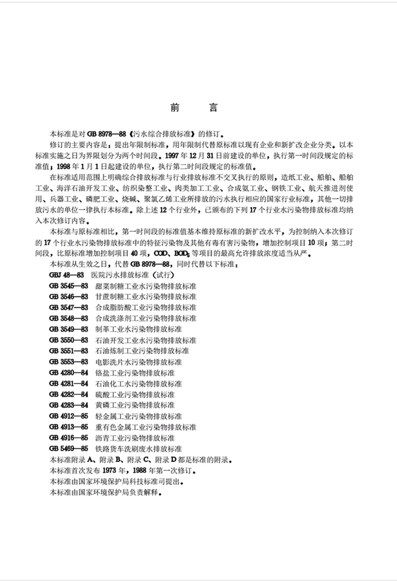 為貫徹《中華人民共和國(guó)環(huán)境保護(hù)法》、《中華人民共和國(guó)水污染防治法》和《中華人民共和國(guó)海洋環(huán)境保護(hù)法》,控制水污染,保護(hù)江河、湖泊、運(yùn)河、渠道、水庫(kù)和海洋等地面水以及地下水水質(zhì)的良好狀態(tài),保障人體健康,維護(hù)生態(tài)平衡,促進(jìn)國(guó)民經(jīng)濟(jì)和城鄉(xiāng)建設(shè)的發(fā)展,特制定本標(biāo)準(zhǔn)。 本標(biāo)準(zhǔn)按照污水排放去向,分年限規(guī)定了69種水污染物最高允許排放濃度及部分行業(yè)最高允許排水量。