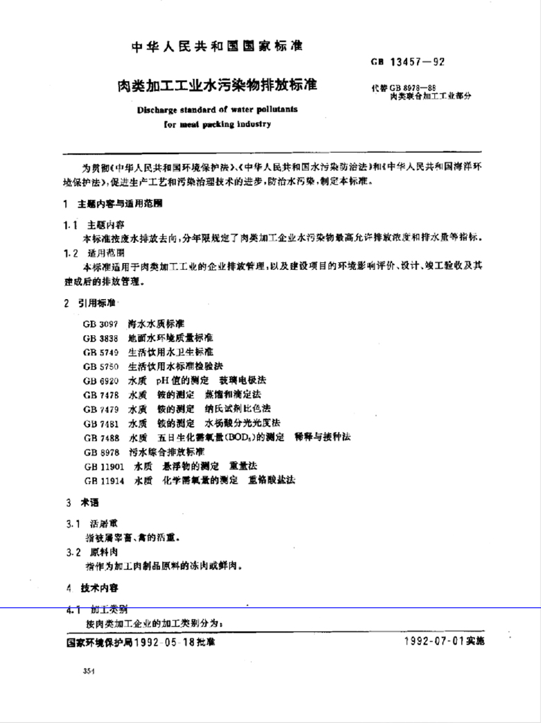 本標(biāo)準(zhǔn)按廢水排放去向,分年限規(guī)定了肉類加工企業(yè)水污染物最高允許排放濃度和排水量等指標(biāo)。本標(biāo)準(zhǔn)適用于肉類加工工業(yè)的企業(yè)排放管理,以及建設(shè)項目的環(huán)境影響評價、設(shè)計、竣工驗收及其建成后的排放管理。