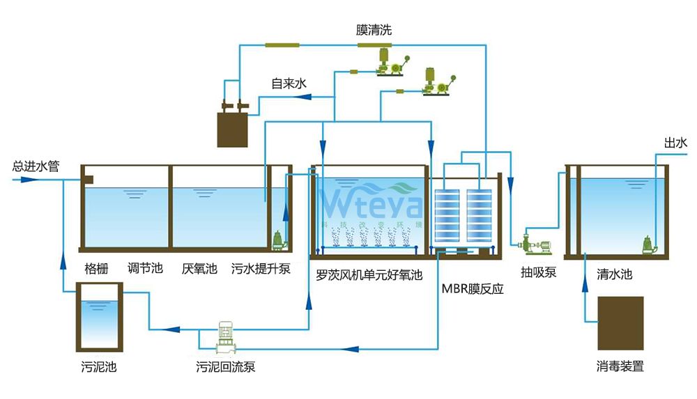 原水 → 格柵 → 調(diào)節(jié)池 → 提升泵 → 生物反應(yīng)器 → 循環(huán)泵 → 膜組件 → 消毒裝置 → 中水貯池 → 中水用水系統(tǒng)