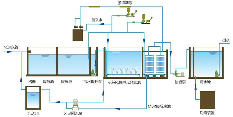 原水→格柵→調(diào)節(jié)池→提升泵→生物反應(yīng)器→循環(huán)泵→膜組件→消毒裝置→中水貯池→中水用水系統(tǒng)